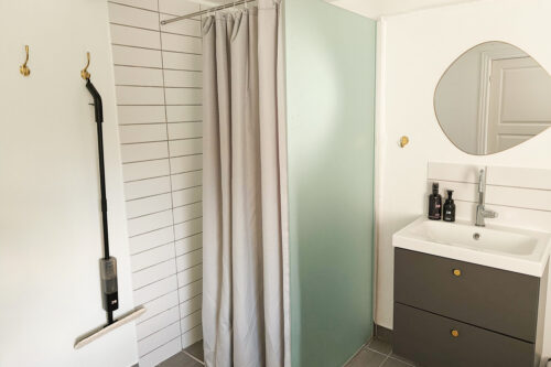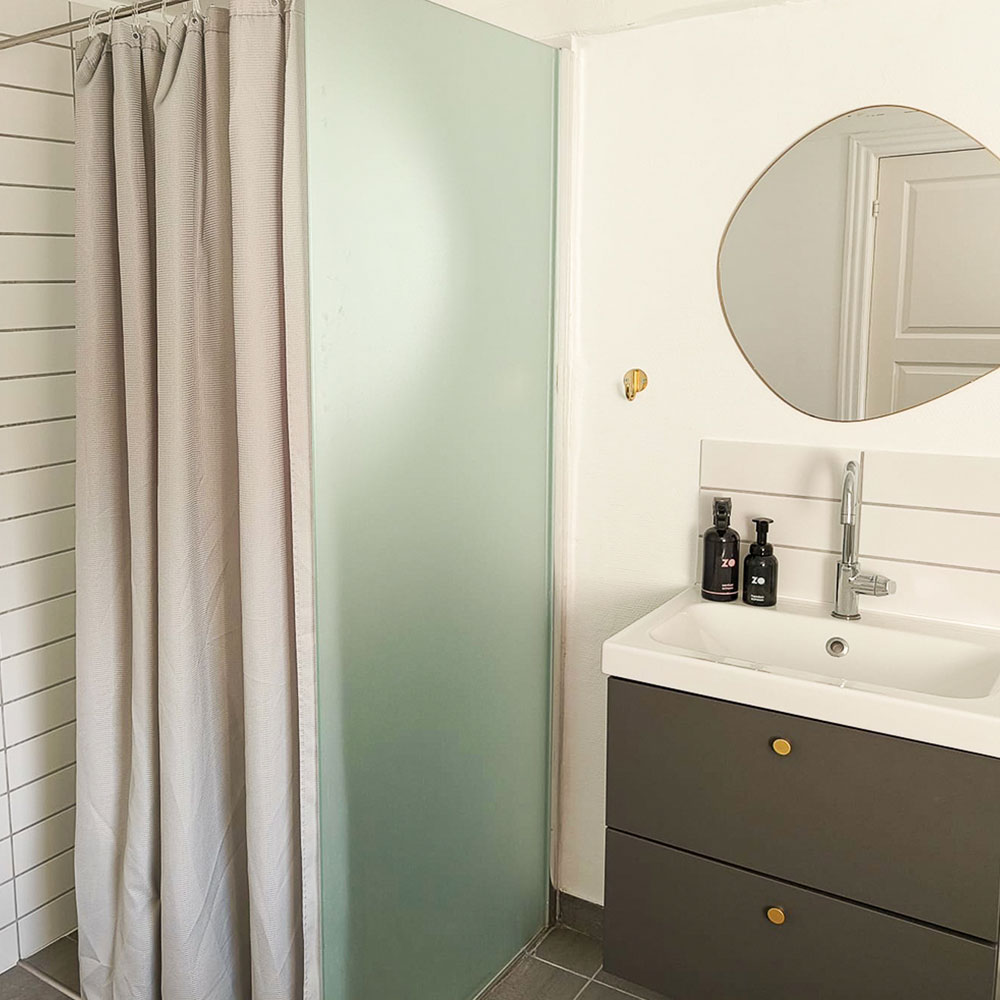 De gedeelde badkamer heeft een lekkere douche, wastafel met handpompje van ZO, toilet en zelfs vloerverwarming die net als in de kamers naar eigen behoefte is in te stellen.