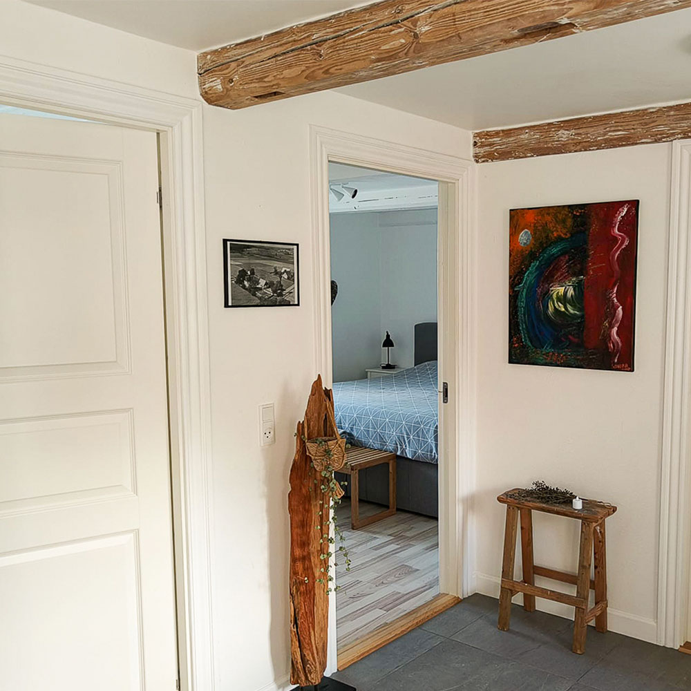 Via de ingang van ons achterhuis kom je in de gezellige hal, die toegang biedt tot de slaapkamer en badkamer, beiden zijn voorzien van vloerverwarming.