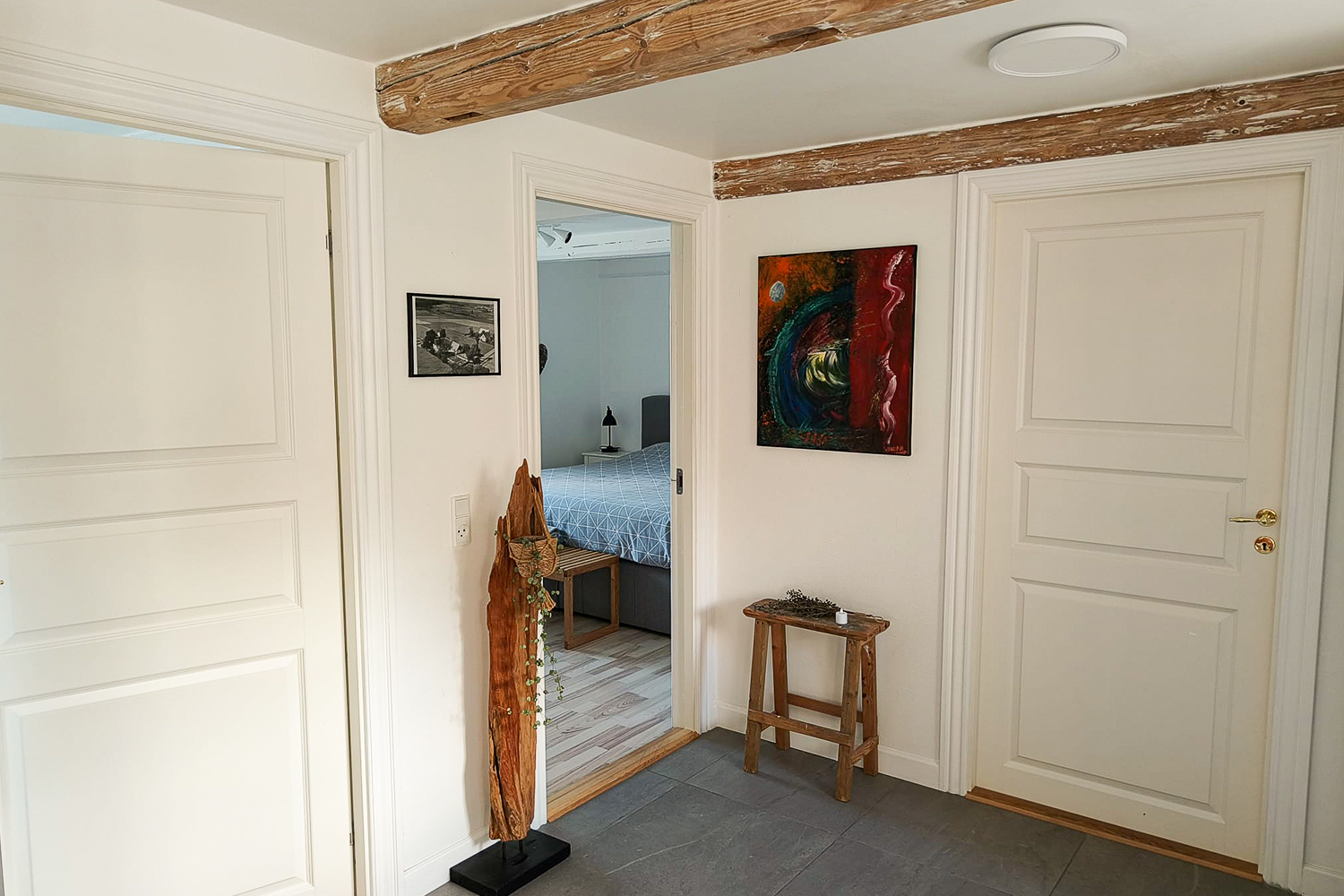 Via de ingang van ons achterhuis kom je in de gezellige hal, die toegang biedt tot de slaapkamer en badkamer, beiden zijn voorzien van vloerverwarming.